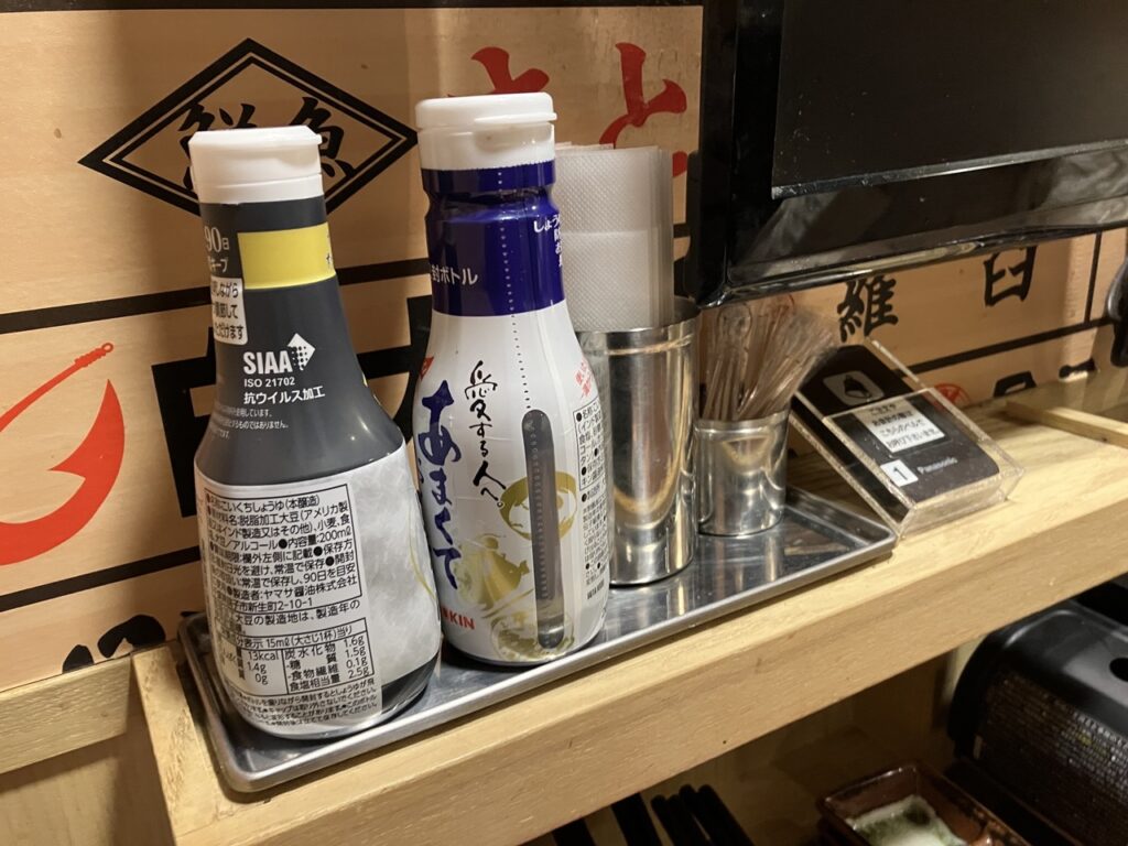 調味料:七味唐辛子、塩、醤油(刺身専用と普通の醤油がある)