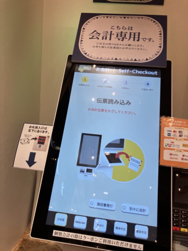 しばらくするとご飯が来るので食事をし、帰る際にバーコード付きのレシートを持って入り口付近の券売機(精算機)でセルフ会計します。
