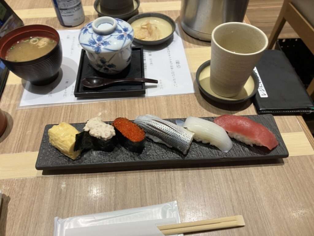 - お得握りセット。1000円以下でにぎり6つと味噌汁と茶碗蒸しがついてくる。